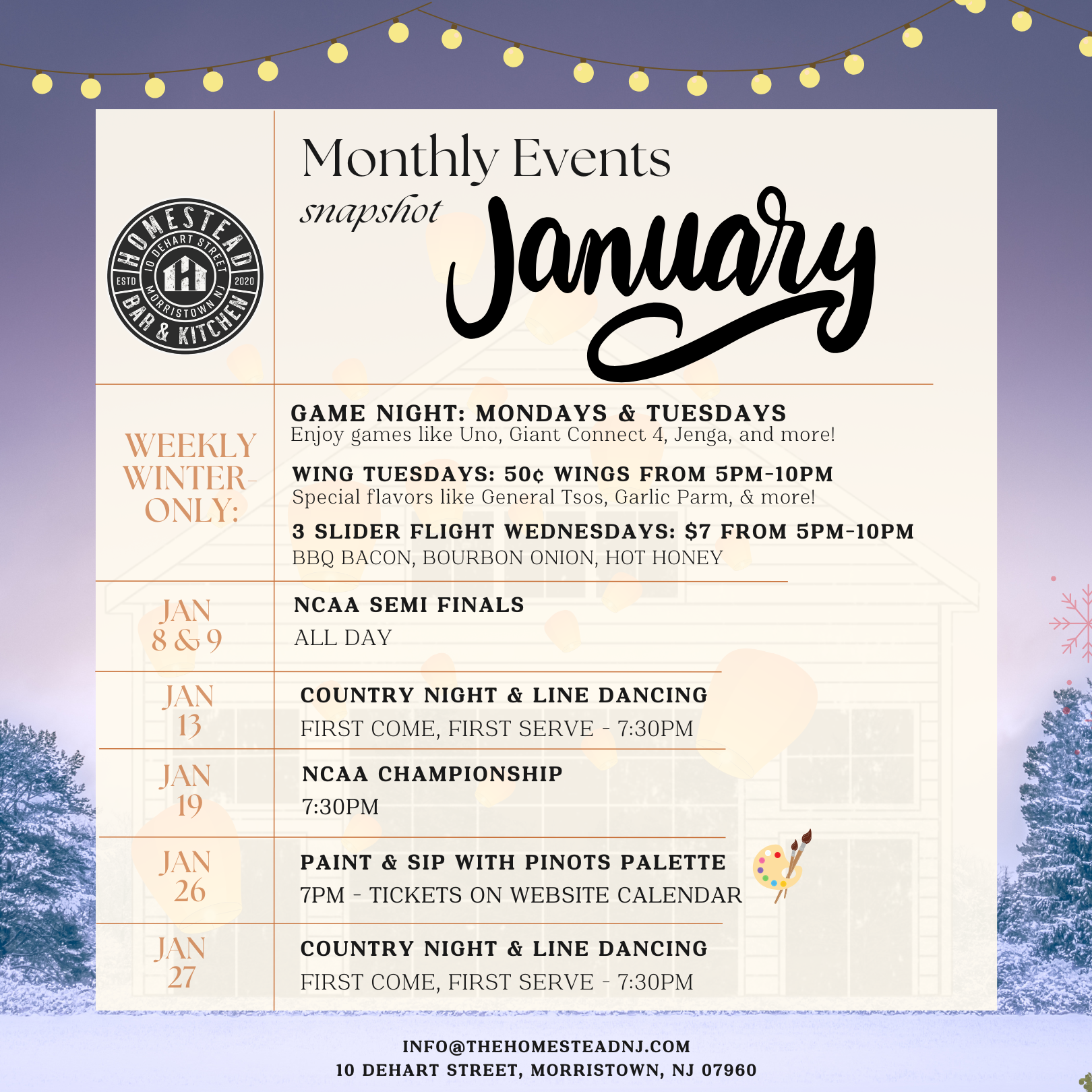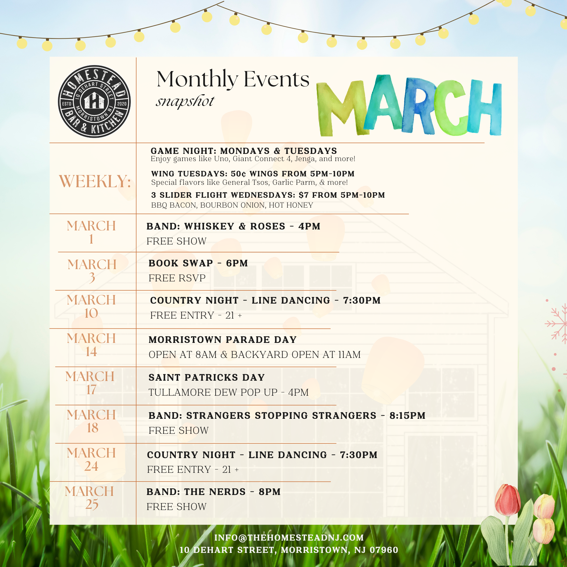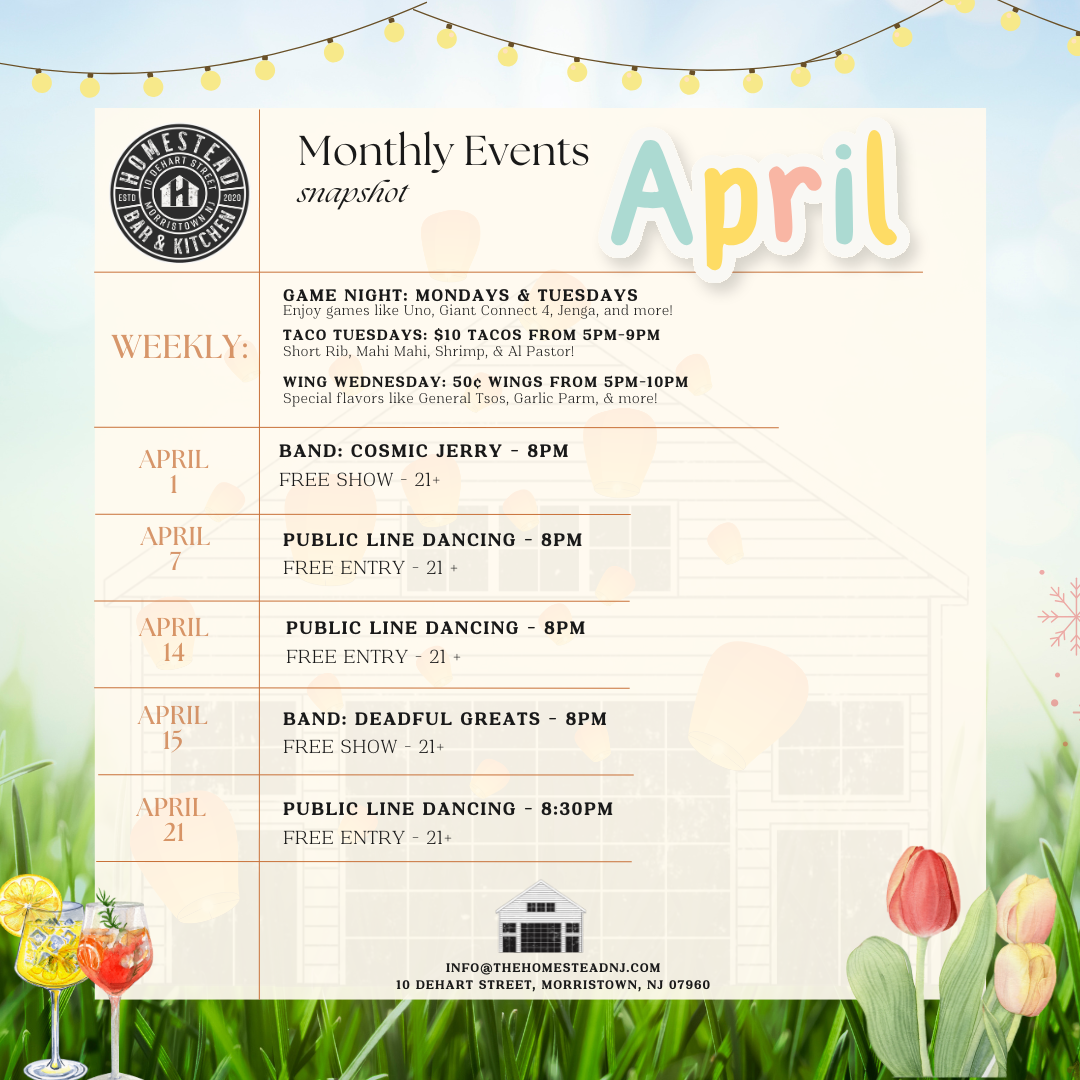 Homestead is where good times take root! Located in the heart of Morristown, our vibrant bar and kitchen hosts a variety of public events - from lively happy hours and creative pop-ups, to live music or DJ sets. Whether you're here to sip, savor, or socialize, Homestead is the neighborhood spot where good vibes grow and unforgettable moments are always on tap.