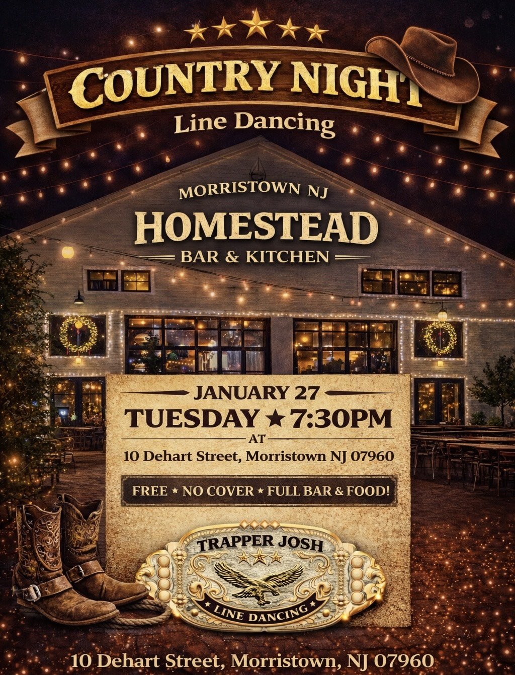 Back to All Events COUNTRY LINE DANCING Tuesday, January 27, 2026 7:30 PM 10:30 PM 10 Dehart Street Morristown, NJ, 07960 United States (map) Google Calendar ICS